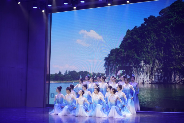 青山簇簇,漓水盈盈。群舞《象山水月》选取中国山水中的典型代表桂林山水作为表现对象,展现了一幅别有洞天的绝美画卷,描述了祖国的大好河山。