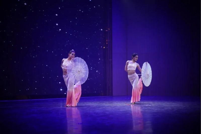民族舞精粹篇:单人藏族舞蹈《恩情》运用道具热巴鼓,展示出别具一格的藏族文化;维族舞蹈《思念》运用身体各个部位的动作同眼神配合传情达意,表现出了热情、豪放、稳重、细腻的风格韵味;双人舞《淅淅沥沥》展现了两位美丽的傣家少女在春的怀抱中尽情俏皮玩耍的场景,婀娜多姿,轻快明朗。