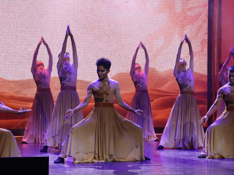 舞蹈《初唐五十七窟》,祥和端庄,动姿柔曼,舞蹈意象化地表达了敦煌飞天、莲花等典型符号,通过舞蹈造型与身体语言的比象形式,展现出人间的美好想象。