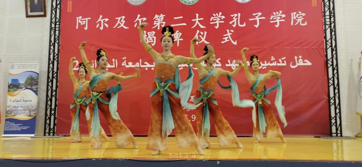 仪式现场,阿尔及尔二大中文系学生与我院师生联袂献艺,诗歌吟诵、中国传统舞蹈、书法展示等节目依次呈现,构建起中阿文化交流的生动场景。我院师生演绎的中国传统舞蹈,以蕴含文化特色的服饰搭配舒展的肢体语言,自然流露东方美学韵味,与现场的诗歌吟诵、书法展示相互呼应,为仪式增添了浓厚的文化气息。