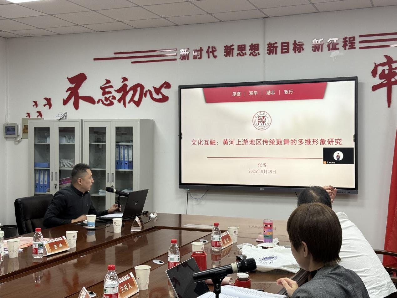 宝鸡文理学院张涛副教授的发言题目是《文化互融:黄河上游地区传统鼓舞的多维形象研究》,他指出黄河上游地区的传统鼓舞,是铸牢中华民族共同体意识一个极具生命力的文化载体和实践路径。通过视觉(器物、身体、场图)、听觉(鼓声、人声、器乐)、动觉(身体参与)三重形象维度,生动塑造了“多元一体”的中华民族共同体形象,使其可观、可听、可感。传统鼓舞以其深厚的群众基础、鲜明的交融特质和强大的感知体引象的共同体意识转化为具身的、可参与的实践,为推进民族团结进步事业提兴了宝贵的艺术资源和创新启示。