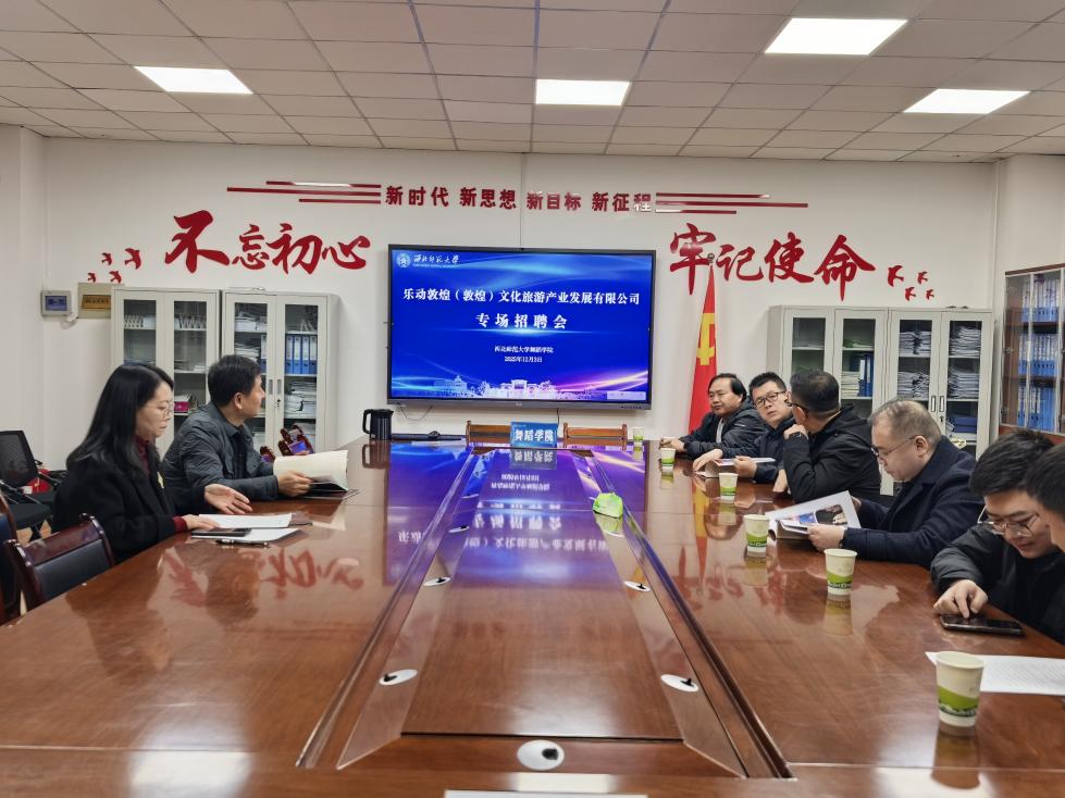 为搭建优质就业桥梁,助力2026届毕业生精准对接就业资源,12月3日,乐动敦煌(敦煌)文化旅游产业发展有限公司在学院405实训室举行专场招聘会。甘肃演艺集团文旅产业发展有限公司及乐动敦煌(敦煌)文化旅游产业发展有限公司一行莅临现场,英国365集团公司副院长吴军、党委副书记杨俊萍、团委书记罗田及毕业班班主任出席招聘会,2026届全体毕业生参加此次招聘活动。